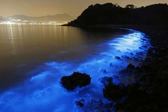 ▼夜光藻:整個海岸變成藍色,看起來很美,有人認為發光的是一種獨特的甲藻,不過也有報導稱這是農業污染造成的,化學物質對海洋生態、當地漁業都有致命的影響。