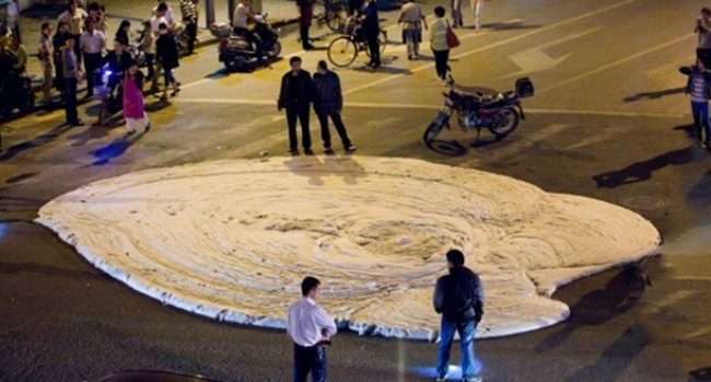 ▼神秘滲出物:2013年5月,中國南京的一個交叉路口路面突然斷裂,還噴出了很多白色泡沫,散發著難聞的味道。相關部分表示,這是地鐵施工造成的事故,地铁基建时向地下填充泡沫剂,壓強過大衝破了地面。