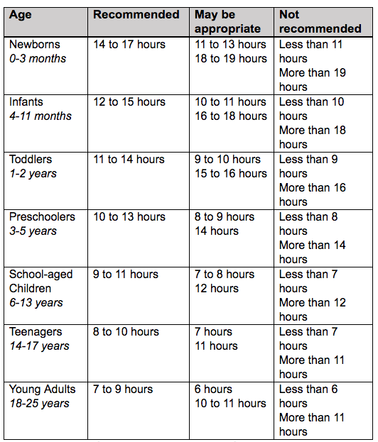 ▼美國衛生研究網站上也指出,早睡的孩子「能睡得更久」。為了長身體,小孩需要大量的睡眠,從國家睡眠基金會的這張圖表上,就可以看出每個年紀的小孩大約需要睡多久。(由左至右的欄位分別是:年齡、建議睡眠時數、尚可的睡眠時數、不建議的睡眠時數)