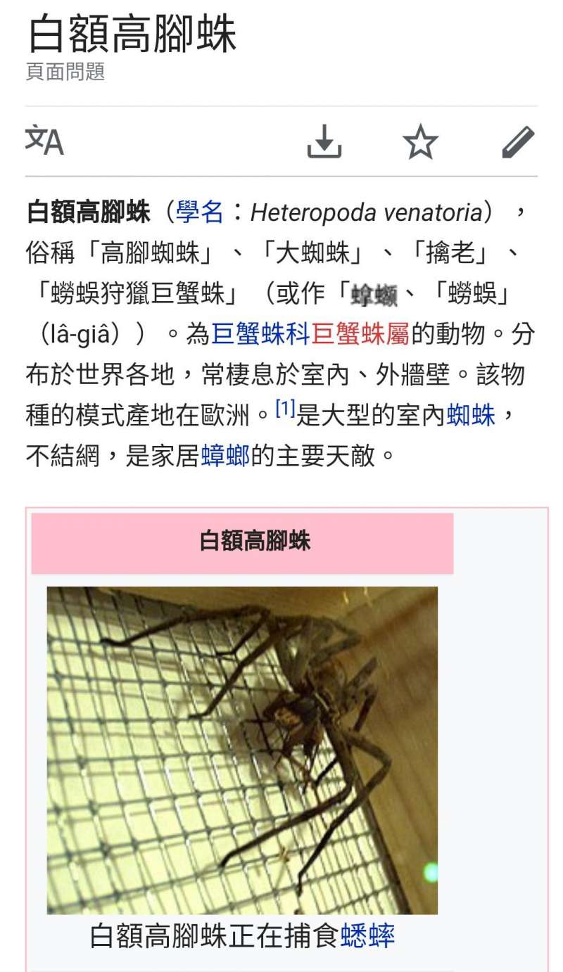 ▼最終有專業人士表示這種蜘蛛學名叫做「白額高腳蛛」,俗稱「喇牙」,分布於世界各地是大型的室內蜘蛛,長年棲居室內不結網,是家居蟑螂的天敵。白額高腳蛛喜歡躲在屋頂或者櫥櫃的縫隙,喜歡陰暗潮濕的地方。