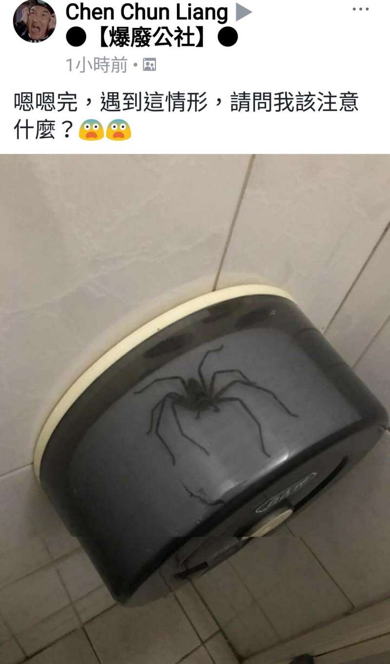 ▼網友在爆廢公社po圖並附文「嗯嗯完看到這樣一幕,我該怎麼辦?」原來廁紙上有一隻巨大的蜘蛛,瞬間讓人聯想起一系列的毒蜘蛛恐怖事件。