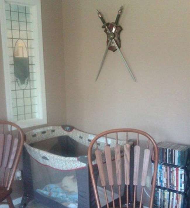 ▼​請把牆壁上的劍取下來,它們就在小孩頭上!