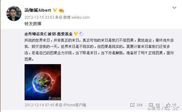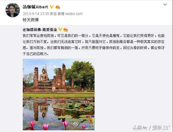 ▼湯珈鋮的微博上也都沒有任何炫富的文章,甚至連一張自己的照片也沒有。上面大部分都是分享一下慈善事業和有禪意的文章。