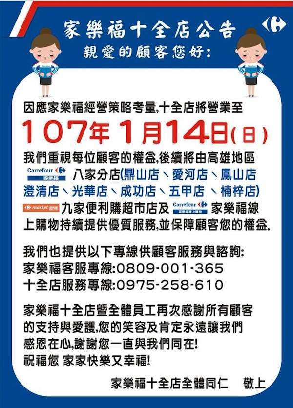 ▼家樂福十全店在臉書粉專公告,為了經營策略考量,將營業至1月14日停止,「我們重視每位顧客的權益,後續將由高雄地區其他8家分店、9家便利購超市及家樂福線上購物,持續提供服務並保障顧客權益。」