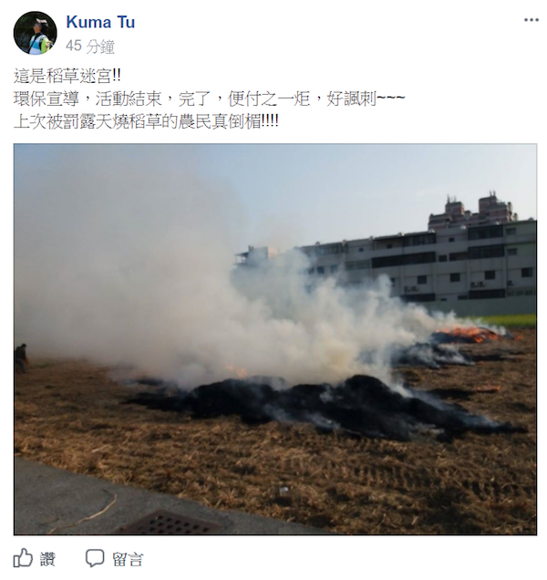 2018年01月05日農家露天燃燒稻草容易造成空汙,為了宣導不能燒稻草的觀念,嘉義環保局特別委託製作「稻草迷宮」,讓親子在裡頭同樂,沒想到活動結束後,4.5噸的稻草就被放火焚燒,讓目擊網友感嘆:「好諷刺!」