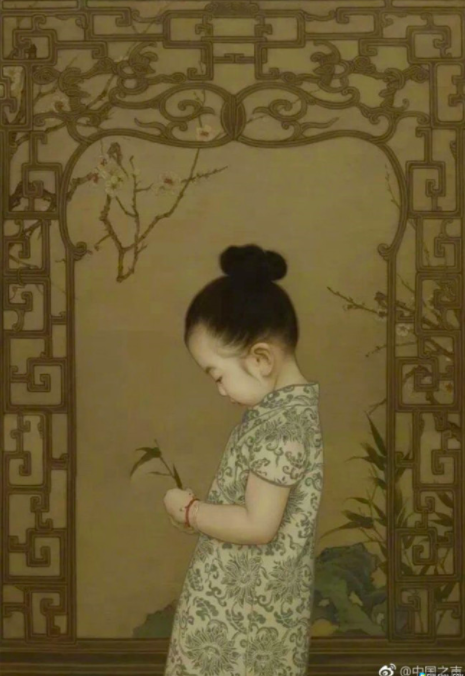 ▼可愛的女兒身著旗袍,四周鑲著中國傳統的窗櫺,遠方襯著山水景緻。