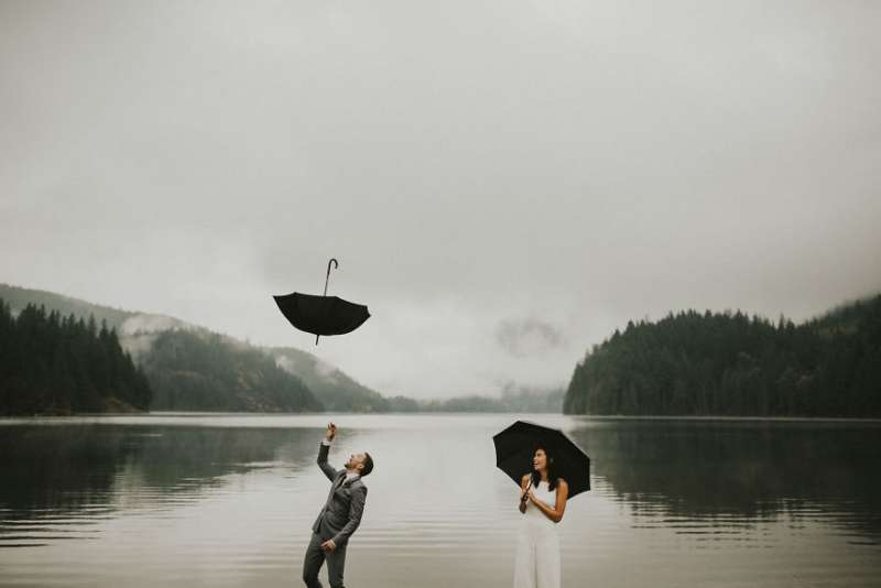 ▼新郎調皮地將傘往上拋,新娘在一旁開心地咧嘴大笑。