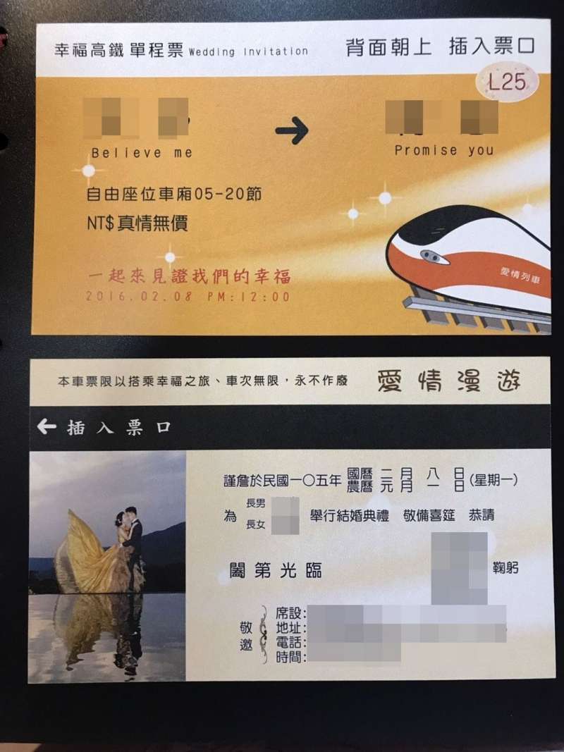 ▼其實還有很多人不甘於使用一般的喜帖,研發出特別形式的喜帖。像這張喜帖就是模仿「高鐵乘車券」,高喊真情無價~
