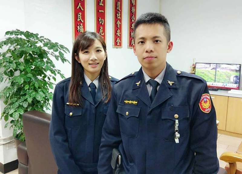 ▼新娘和新郎在桃園大園警分局大園派出所結識,女方剛進入派出所實習時人生地不熟,多虧有男方細心照顧,而能快速地融入職場環境。而後,兩人在工作上互相扶持,感情逐漸升溫。俊男美女的組合,讓收到喜帖的同事們為他們拍手叫好。