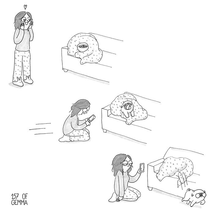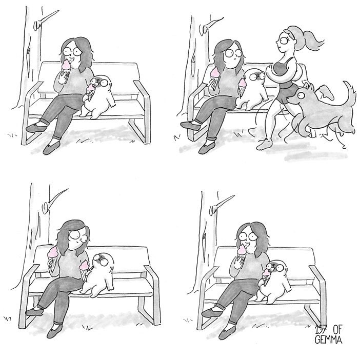 一位生活在紐約的西班牙藝術家嘉瑪(Gemma Gené)非常愛自己的寵物狗,以至於剛出門就開始想牠了。所以每天在上班的地鐵上就開始把她和狗狗的日常畫下來,每一張漫畫都很有趣。嘉瑪說沒有工作的時候,她整天都和狗狗待在一起,每天都在畫牠,喜歡用這種方式把她和狗狗相處的畫面記錄下來。她從事多種形式的繪畫和雕像創造,但是讓她出名的卻是這些可愛的狗狗漫畫。