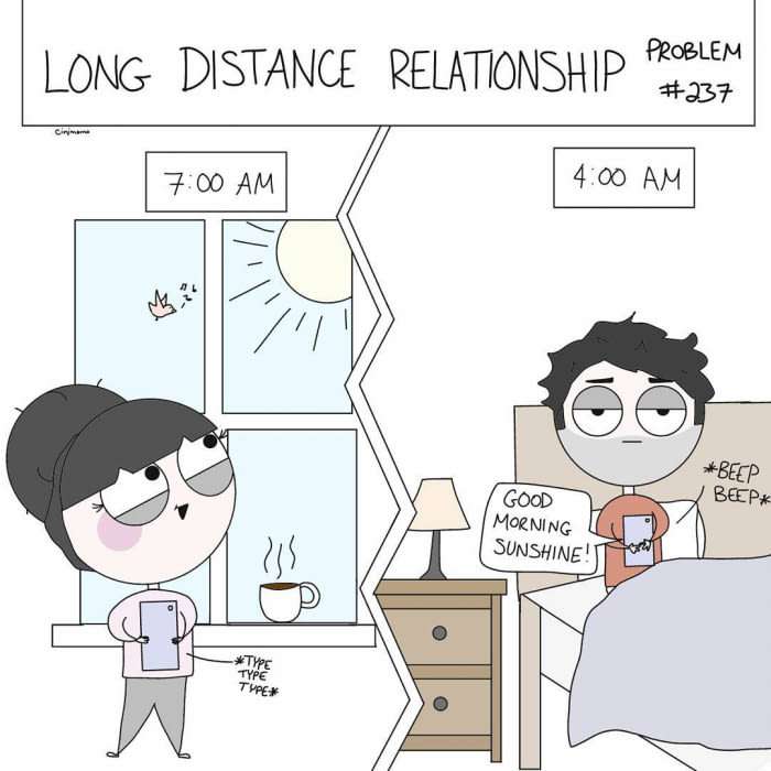早上7點鐘,女友開始傳簡訊問候,而男友那邊還是凌晨4點,只能強忍睏意,假裝高興地回簡訊。