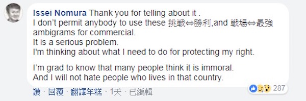▼野村一晟也向大家告知,他並沒有授權任何人使用這組字體,被剽竊是一個嚴重問題,他會思考如何去保護自己的權益,最後也說:「我很高興有很多人知道這種行為並不道德,我也不會因為這樣就去討厭那個國家的人民。」