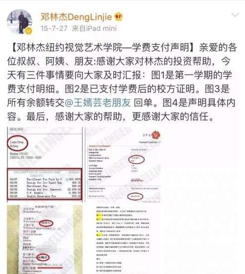 2018年01月14日來自中國北京的鄧林杰在2015年考上了世界排名前10的藝術學校「美國紐約視覺藝術學院」(School of Visual Arts),無奈家境貧窮無法出國遊學。於是他在微博上開出了20%利息的群體募資,提出「2年後本金連同20%利息的還款」或是「免費替資助者工作」等條件,在一星期內就成功籌到了50萬人民幣(約新台幣230萬元)的學費,讓他終於能夠如願前往美國求學。
