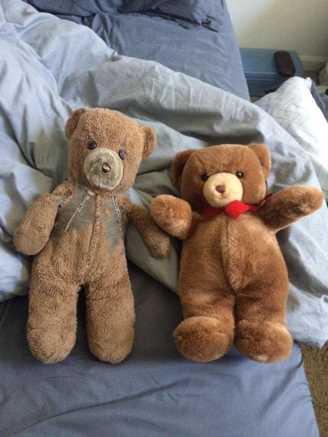▼你可能不相信這是兩隻一模一樣的熊寶貝吧!左邊那隻「陪睡」了30幾年,而右邊那隻一直保存在儲藏櫃中。