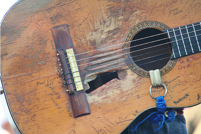 ▼一看就覺得這把吉他歷史悠久,琴身都被彈到破洞了!