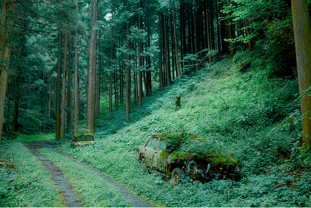 ▼兩輛車被棄置在森林中,時間一久,車子被青苔與植物佔據…想必再也無法發動了吧!