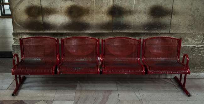 ▼地鐵中的座位上竟出現一排「幽靈鬼影」!仔細一瞧,原來這幾個可怕「鬼影」,是人們頭部磨擦牆面之後,留下的歲月痕跡。
