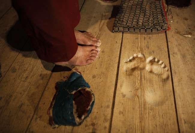 ▼僧侶每日在同一個地點行禮,經過數十年,他的腳印深深烙印在地板上。