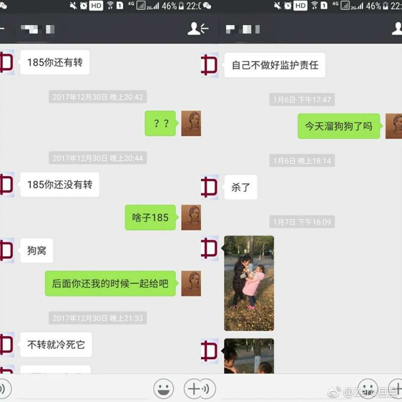 ▼「Zero旦旦」非常疼愛自己的狗狗,多次懇求賀莉把狗狗還回來。賀莉多次刁難還發微信威脅表示「賣狗肉店了」、「轉錢過來給你喂好點」、「我女兒不喜歡就把牠殺了」、「不給錢把牠冷死」。