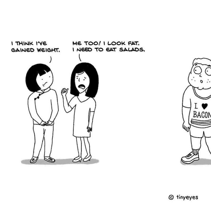 ▼14. 「我覺得我變胖了。」「我也是!我看起來很肥,我需要改吃沙拉了。」