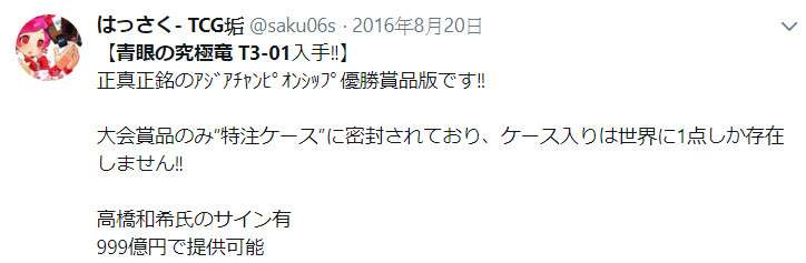 2018年01月17日近日,秋葉原的卡片專賣店內出現了一張《遊戲王》特別版「青眼究極龍」,玩家開價4500萬日圓(約新台幣1200萬),很快在網路上引發轟動。