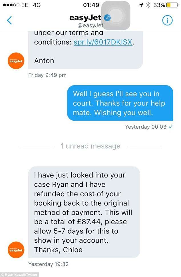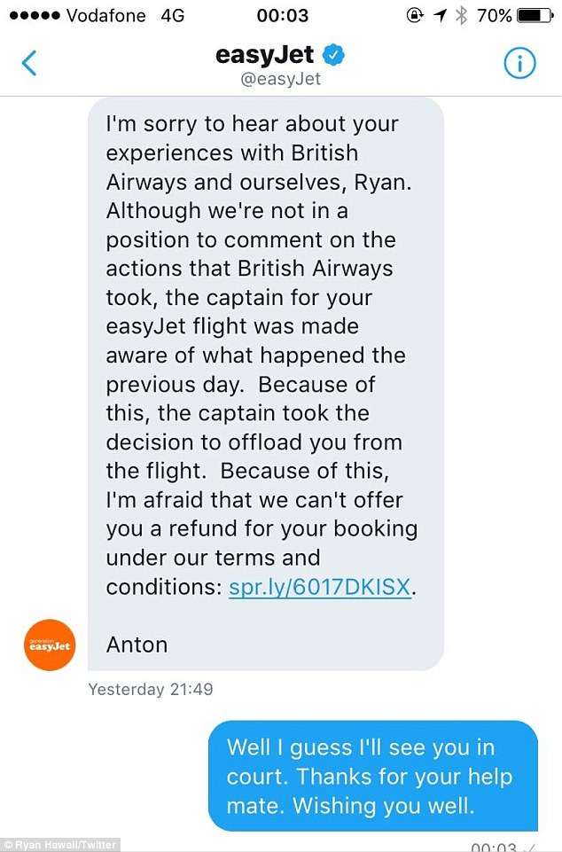 Ryan沒辦法,可憐兮兮在機場待了一夜,直到隔天才搭挪威航空公司的飛機回到倫敦。他回家後越想越氣,在推特上控訴那兩家航空公司種族歧視,不讓他登機。英國航空公司一點面子都沒給他留,直接說「他對我們的行李收費制度有質疑,而且態度不友善,我們只好請警察來處理了。」