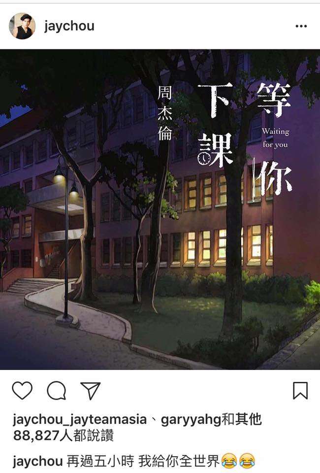 2018年01月18日周杰倫又有新作品啦!1月17日他在Instagram上預告「再過五小時,我給你全世界」,並附上印有「等你下課」四字的圖片。凌晨00:00,影片正式上線,「等你下課」正是周杰倫睽違一年半親自獻唱的新作!