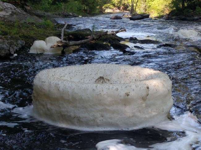 ▼小溪上的泡沫聚集在拐彎處,就像棉花糖。