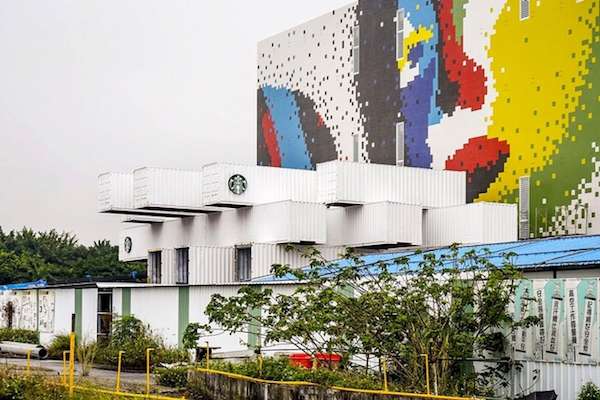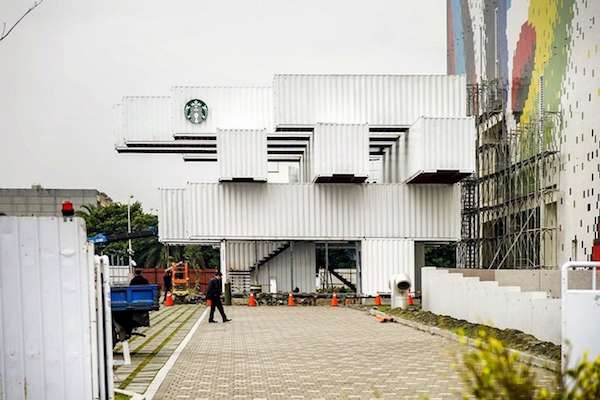 ▼遠遠地看起來,這間星巴克就像許多個樂高積木組裝而成的。白色貨櫃上頭的LOGO也特別搶眼。