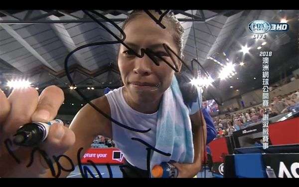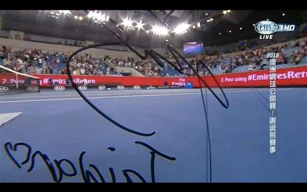 ▼比賽結束後,謝淑薇在鏡頭前以簽字筆寫上姓名與國籍「TAIWAN」,最後附上一個愛心,愛國行徑令所有台灣球迷熱血沸騰!