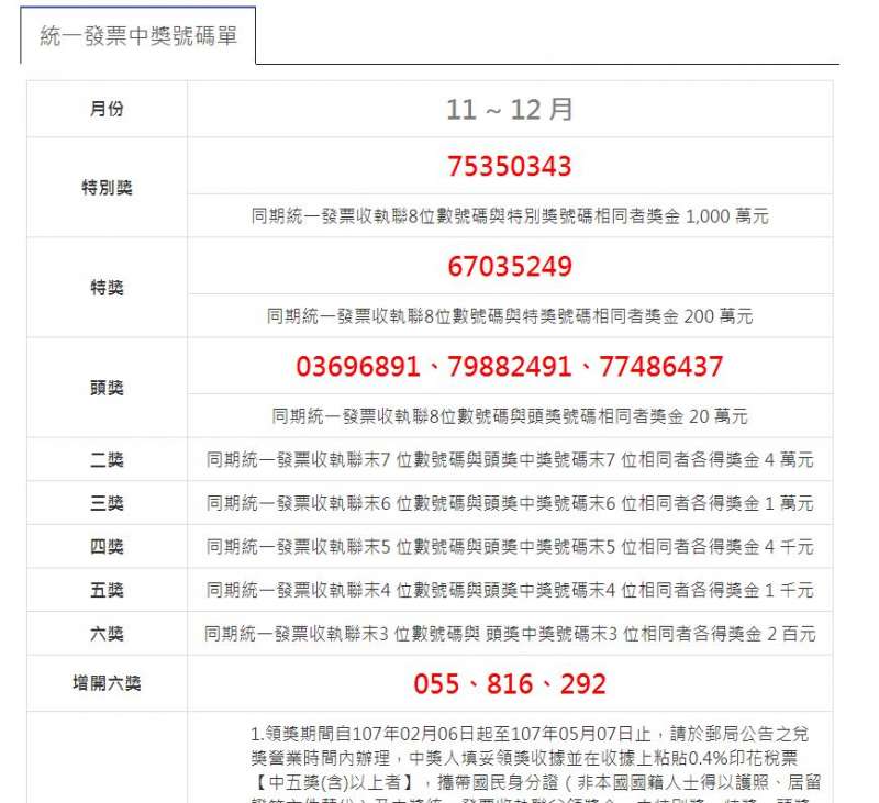 除此之外,還增開六獎,分別是「055」、「816」、「292」,若3碼相符,也可獲得200元獎金。領獎時間由5月5日延長至5月7日,如果中獎一定要記得兌換。