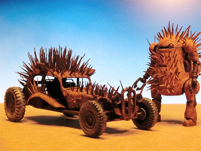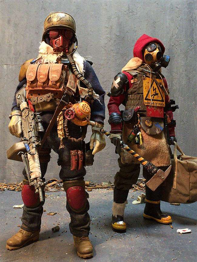 ▼他改裝了玩具的衣服、裝備,加上了防沙護目鏡、多口袋的擋風衣物、防幅射口罩頭盔等等。表面的塵垢污漬非常吸睛,讓人一下子想到絕望的沙漠。