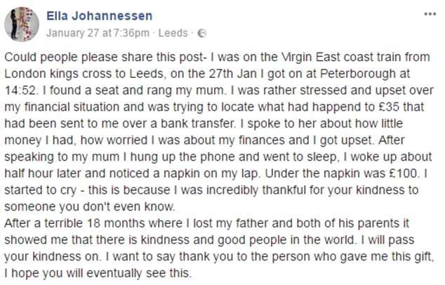 ▼半個小時後她從睡夢中醒來,發現膝蓋上多了一張餐巾紙,下面放著100英鎊(約4100新台幣)。應該是某個好心人聽到她與媽媽說的話,伸出了援手。她非常感動,忍不住將這件事po到了臉書上,希望那位善心人士能夠看見。