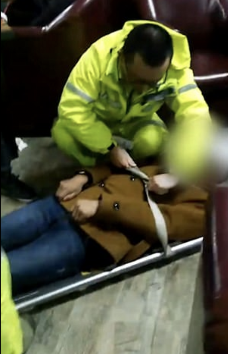 ▼男子連忙向朋友求助。朋友嚇了一跳,隨後撥打急救電話。救護車到場後,醫護人員把男子抬上擔架,準備送到醫院治療。朋友表示:「好像是完全沒有知覺了,動都動不了,真的沒辦法,只好叫救護車來。」