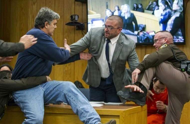 ▼警員很快將這名失控的父親壓在地上,並上戴手銬。Randall不停大喊:「我要殺了那個混蛋!」他隨後被帶出法庭。程序重啓後,Randall向法官致歉,法官表示理解他的心情。