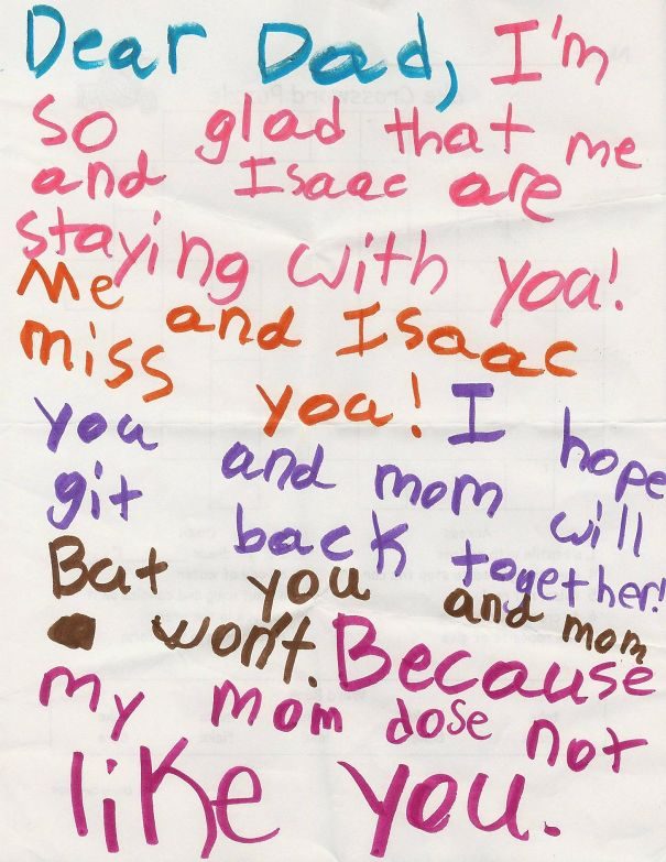 ▼「親愛的爸爸,我很享受和你還有Isaac在一起的時光,我們都很想你,希望你和媽媽能和好。但我知道那不可能,因為媽媽不喜歡你。」