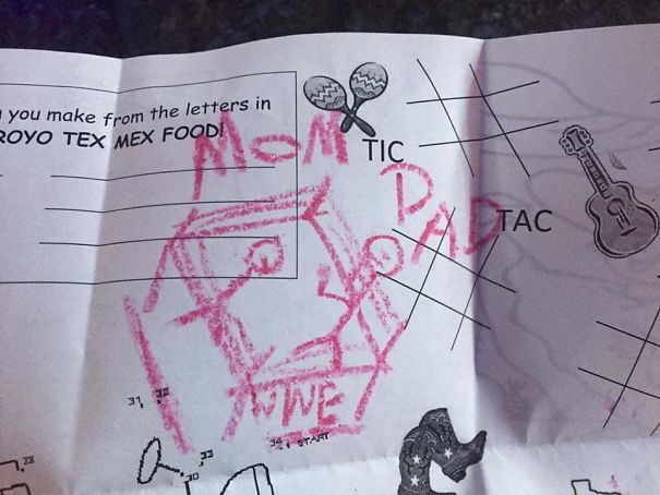 ▼小朋友在餐廳點菜的單子上畫了爸媽打架的樣子。