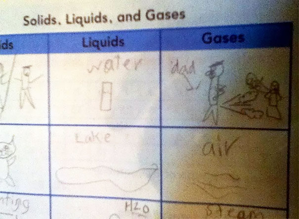 ▼請畫出固體、液體、氣體,最後的氣體是老爸在放屁。