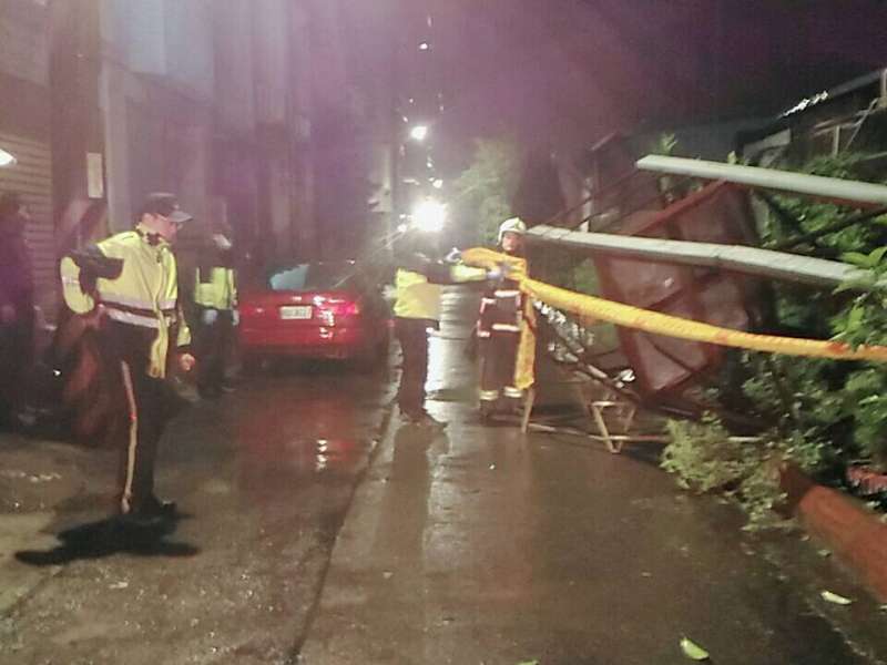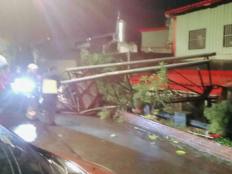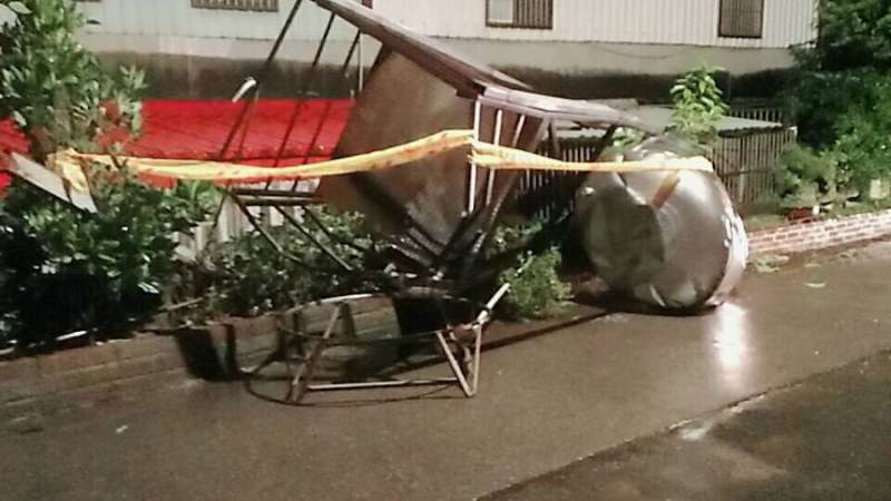 ▼新北市鶯歌也傳出災情!在國際二路上,巨大的水塔的赫然倒下,佔據了整條小巷空間。