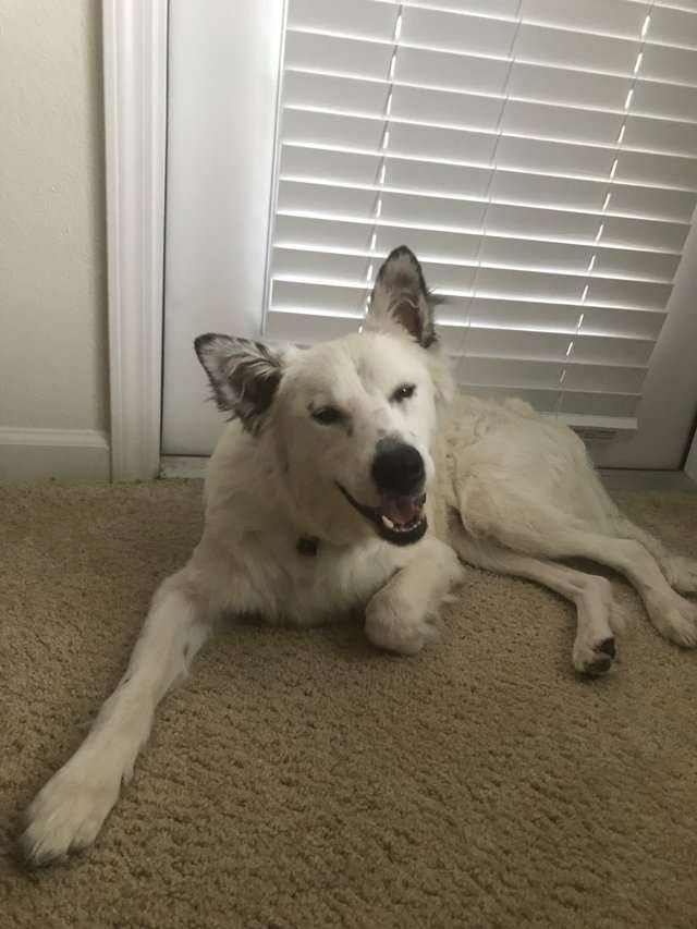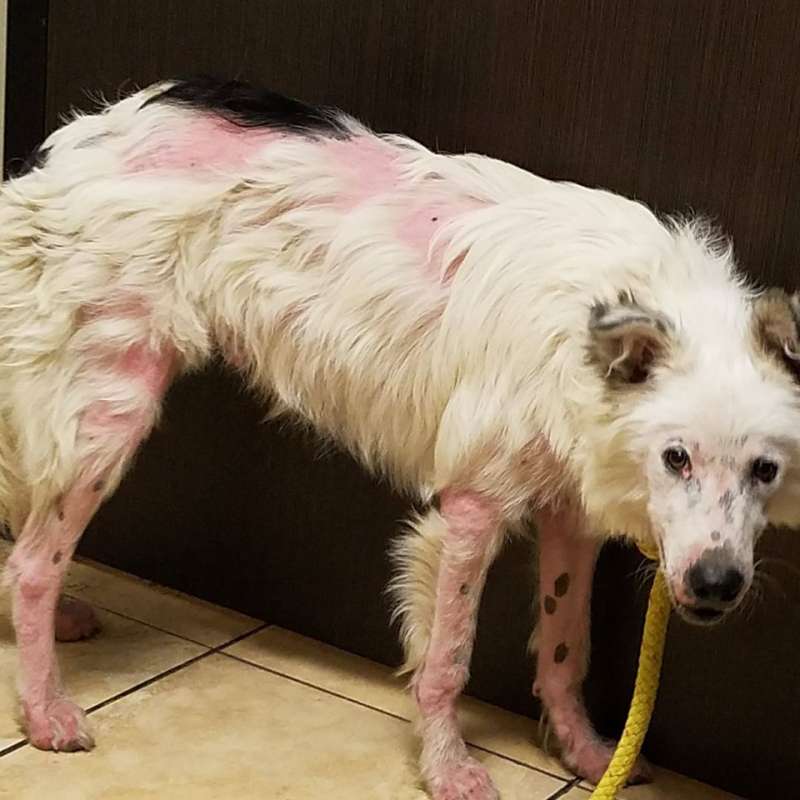 2018年02月06日美國奧克拉荷馬州有一隻叫Kong的1歲白色邊境牧羊犬,牠嚴重曬傷,還罹患皮膚病,毛髮脫落,露出粉紅色的皮膚,看起來很可憐。