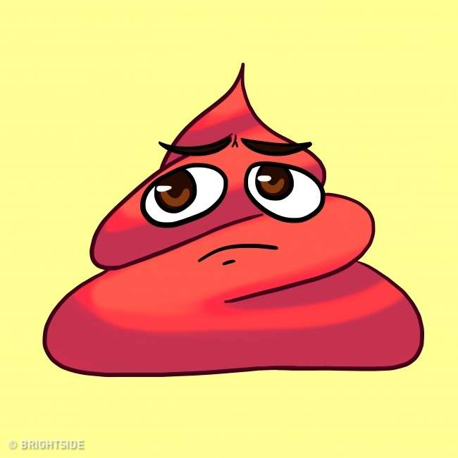 紅色:許多食物都會讓大便變紅如:火龍果、番茄等等,不過如果發現糞便中帶血的話,請馬上到醫院求助,因為這可能是肛裂甚至更嚴重的症狀如:痔瘡、潰瘍性結腸炎甚至大腸癌。