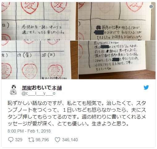2018年02月07日夫妻鬥嘴很正常,但再好的感情也經不起消磨,每天都吵架的話就危險了。日本一名28歲的人妻知道自己脾氣不好,經常為了雞毛蒜皮的小事與丈夫爭吵。她從年初開始寫日記,只要當天沒有發脾氣,丈夫就會在日記上蓋「愛的印章」。因為這本超有愛的日記,她的脾氣有所收斂,夫妻的感情也變好了。