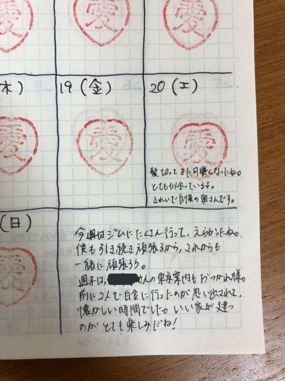 ▼「今天你剪了短髮,好可愛!很適合你!我有一個漂亮的好妻子,好驕傲啊!」「這週你去了好幾次健身房,真棒!我也要努力堅持下去,一起加油。週末你陪我帶朋友遊覽東京,辛苦啦。我想起了我們之前去看房子的經歷,真難忘,希望我們的新家早日建成!」