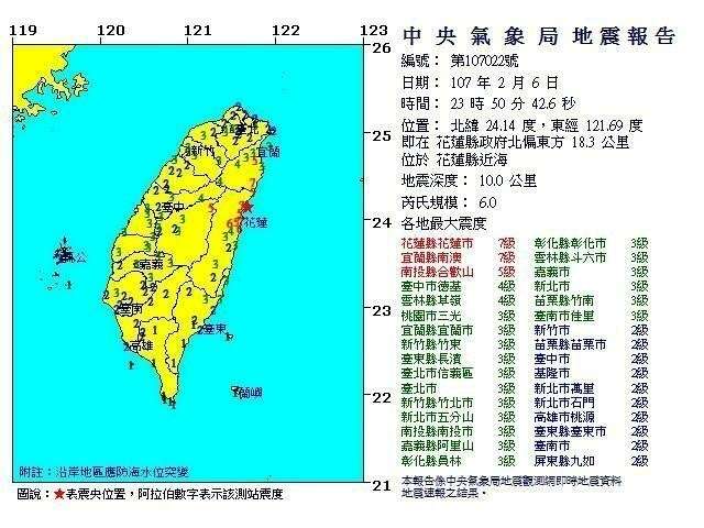 2月6日晚11時50分左右,花蓮近海發生規模6.0地震,地震深度10公里。2月4日晚曾發生5.8地震。氣象局表示,6.0地震才是主震,5.8為前震,主震之前已有94個有感地震發生,主震之後約3小時,則有約40起餘震,累計序列有感地震已經超過130起!