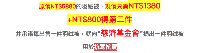 ▼該廠商以「合隆羽藏」的名義,宣稱原價5880的羽絨被僅賣1380,且加800塊再多一件。只要購買羽絨被,就會向慈濟多捐出一條被子,幫助災民。