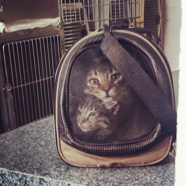 ▼兩隻躲在包包裡的喵星人,其實是圖片。