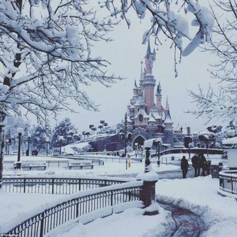 ▼巴黎的迪士尼樂園也被積雪覆蓋,粉紅色的城堡變成了白色。