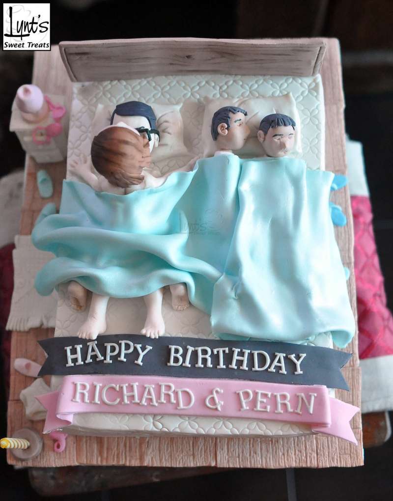 ▼這個蛋糕是一對夫妻的朋友,為了幫這對夫妻慶生而量身訂做的,主題是「爸媽趁小孩在睡覺時偷偷在旁邊啪啪啪!」。