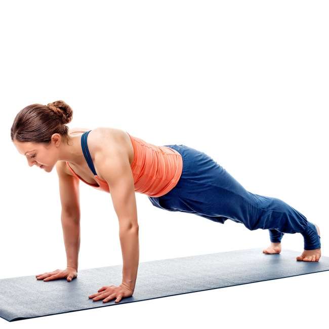 ▼平板式:俯卧,雙手置胸部兩側撐地,雙腳張開約30公分。吐氣,手施力將身體舉離地面,收緊腹肌。夾緊雙臂,身體維持成一直線,與地板平行。盡可能保持的時間長一些,可以多做幾次。