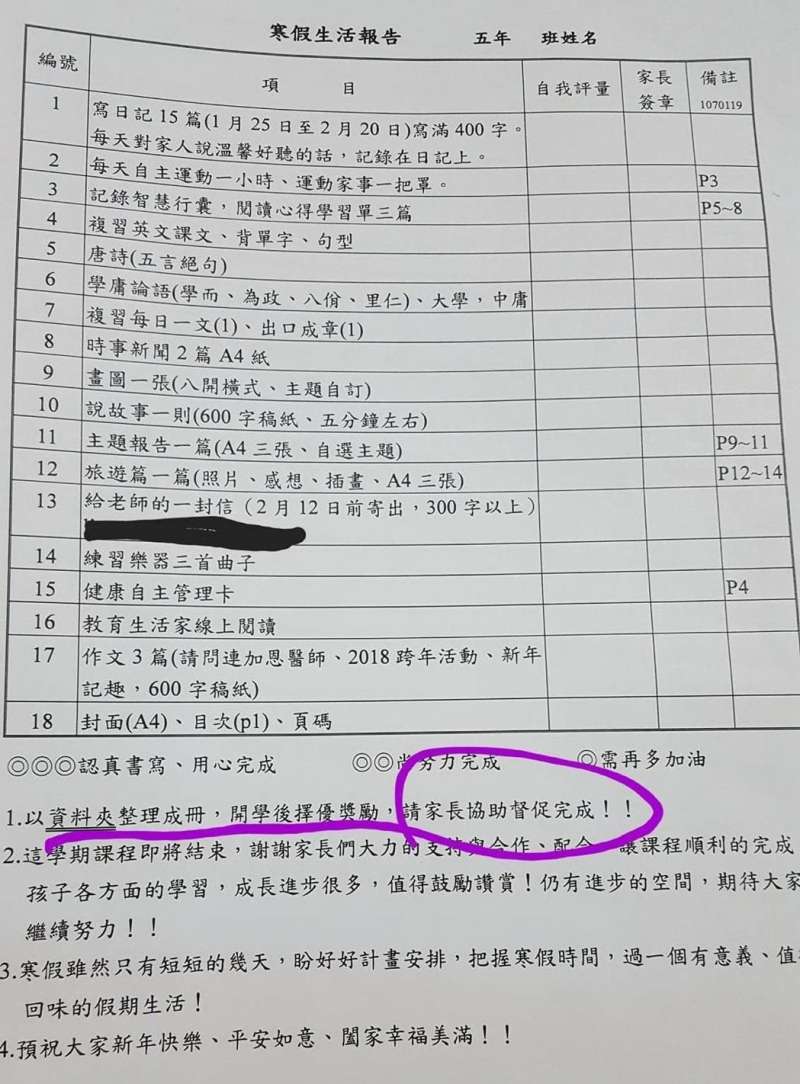 ▼寒假期間,事實上各種寒假作業也引起議論。不久前,就有網友分享學校交給國小學生的寒假生活報告,裡頭洋洋灑灑列了日記、背書、繪圖等無數項工作,還要家長協助孩童「整理成冊」,讓人直呼:「這是搞死家長的作業吧!」